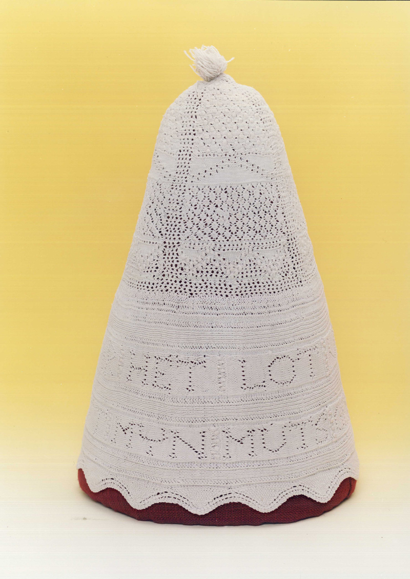 Gebreide slaapmuts met gegolfde rand en ingebreid patroon in ajoursteken. De muts is opgebouwd uit kleine lapjes van breiwerk in diverse steken, met ingebreide tekst: DENKD WAAR HET LOT U LEID, MOENS HEEFT MIJN MUTS GEBREID. Bovenop de muts een pluim van samengebonden katoen. Petronella Moens was dichteres, schrijfster van kinderboeken en blind. Op de 4e foto een schilderij van M.C. Boellaard, Petronella Moens in gezelschap van Antje Camphuis (Paneel). Moens dicteert hier aan haar secretaris Camphuis. Zij heeft daarbij zelf een breiwerk in haar handen. Moens was vermaard voor haar breikunst, terwijl ze ook spon, weefde, knipte en borduurde ondanks haar blindheid.