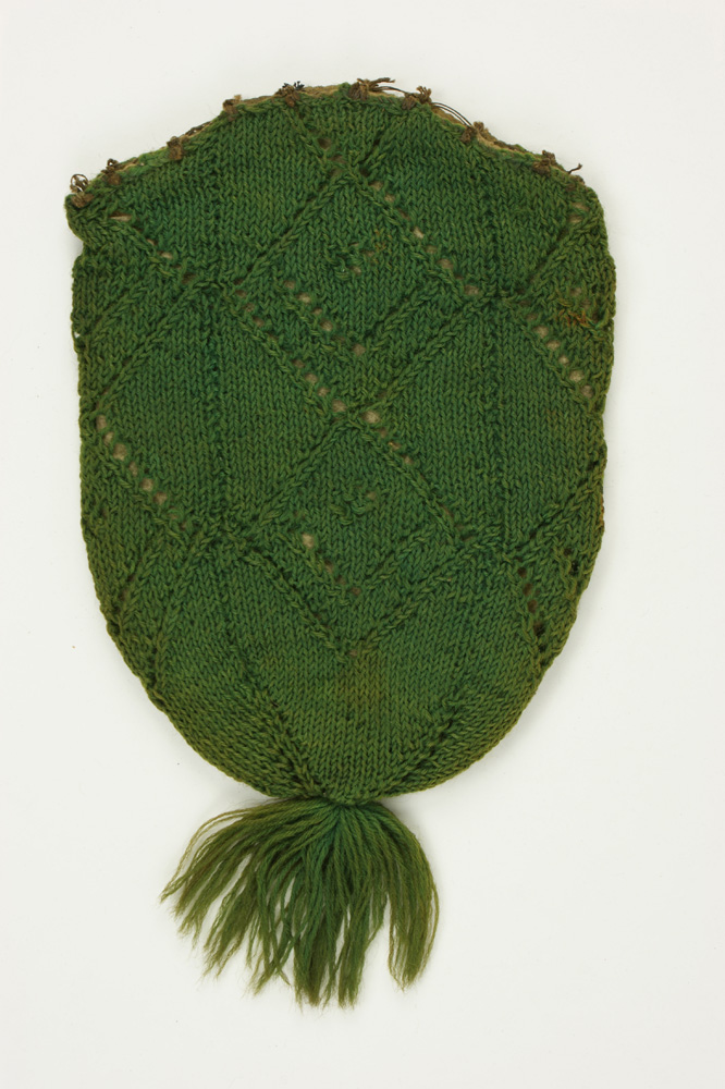 De tassen zijn gebreid van dunne groene wol, de rechter in de zgn. ‘koestrontskleur’ is ouder ca. 1825. Dit vond men toen mooi, een kleur die deed denken aan … inderdaad. Voordat deze tas aan de zilveren beugel uit Schoonhoven werd bevestigd zat er waarschijnlijk eerder een bruine gebreide tas aan.