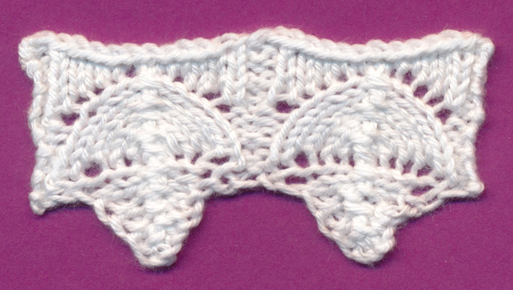 Wanneer je ze vergelijkt met de randjespatronen uit het boek ‘Eutropia’ (1844) die ik ook allemaal heb gebreid, dan zijn deze randjes toch weer anders, al lijkt het soms wel op elkaar, het is nooit precies gelijk. Waarschijnlijk waren veel van deze motiefjes algemeen bekend en men verzon daar eigen varianten op.