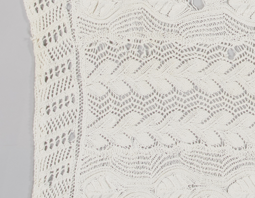 In de collectie van het Openluchtmuseum Arnhem bevindt zich een katoenen gebreide sprei waarvan je hieronder een detail ziet. Daarin is in de banen van het middendeel duidelijk het motief van manchette IV-8 te herkennen en voor de rand is een deel van het patroon van manchette IV-7 herhaald.