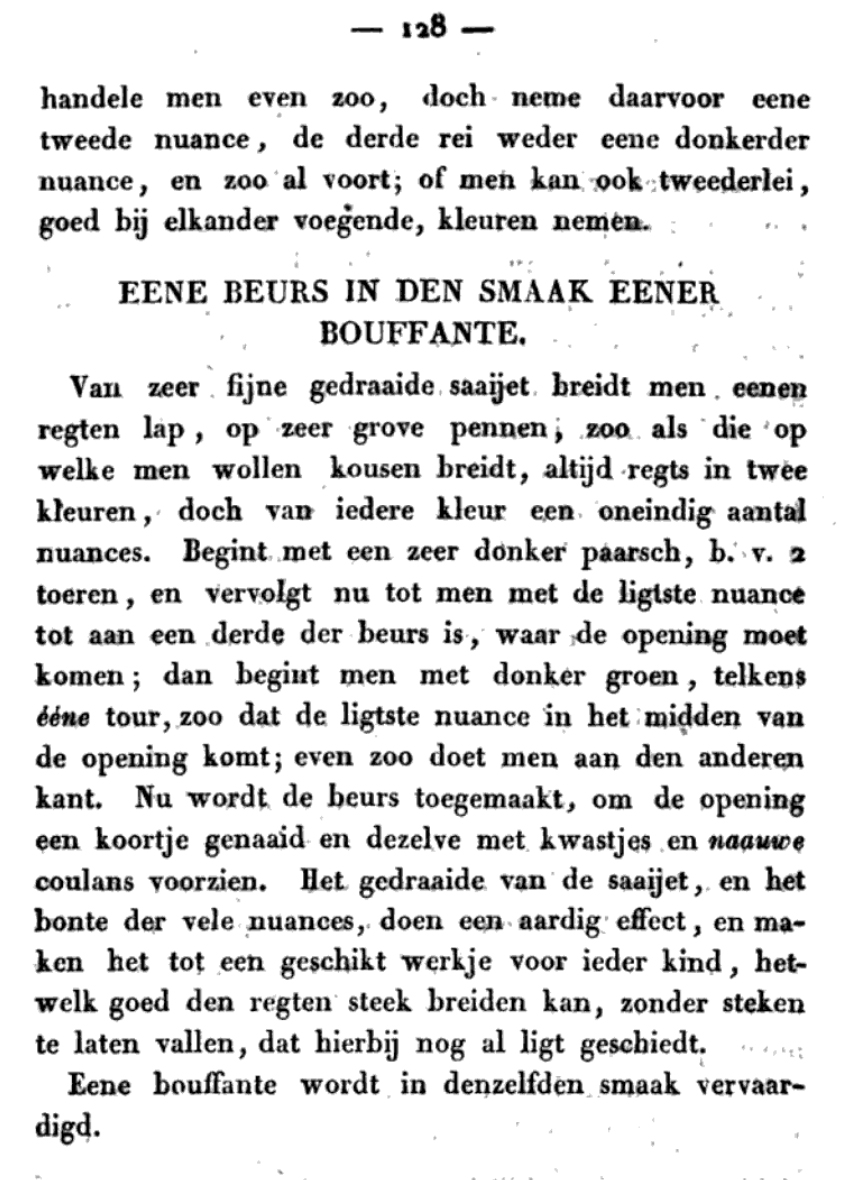 In het handwerkgedeelte van de ‘Penélopé, of maandwerk aan het vrouwelijk geslacht toegewijd’, deel VI uit 1831 is sprake van een gebreide beurs in ‘de smaak’ van een bouffante. Met een beurs wordt een zogeheten kousenbeurs bedoeld, maar alleen geeft ook dit geen uitsluitsel over wat er dan met een gebreide bouffante wordt bedoeld. De beurs is wel een werkje dat geschikt wordt geacht voor ieder kind dat goed recht kan breien zonder steken te laten vallen. Uit de omschrijving op te maken lijkt het me een kleurig geheel met veel nuances van groen en paars.