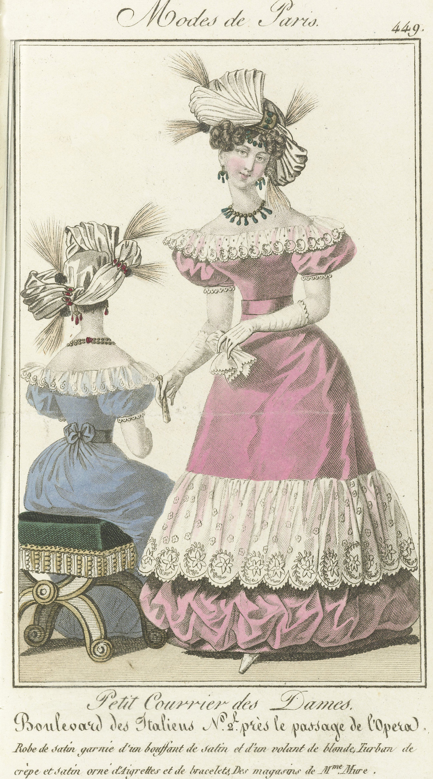 Bij deze modeprent wordt de bouffante zelfs genoemd en daar is het de satijnen garnering van de rok.