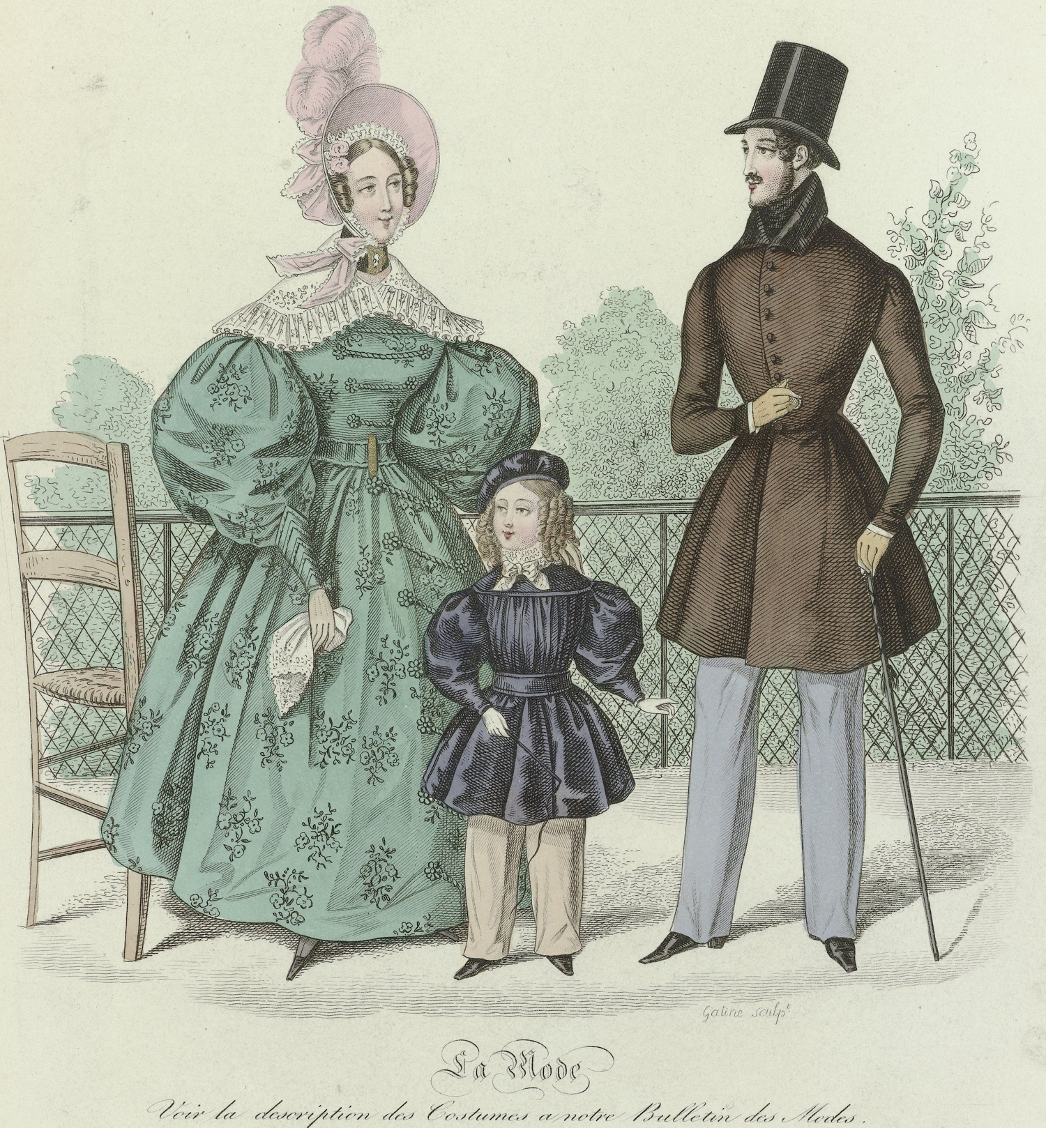 BegIn jaren 30 van de 19e eeuw was de mode zeer volumineus en zie je veel ‘poffende’ mouwen en garneringen zoals op deze twee modeprenten uit het Rijksmuseum goed is te zien. Ook droegen heren vaak een dikke das, gewikkeld om de hals, die ook soms een bouffante wordt genoemd.