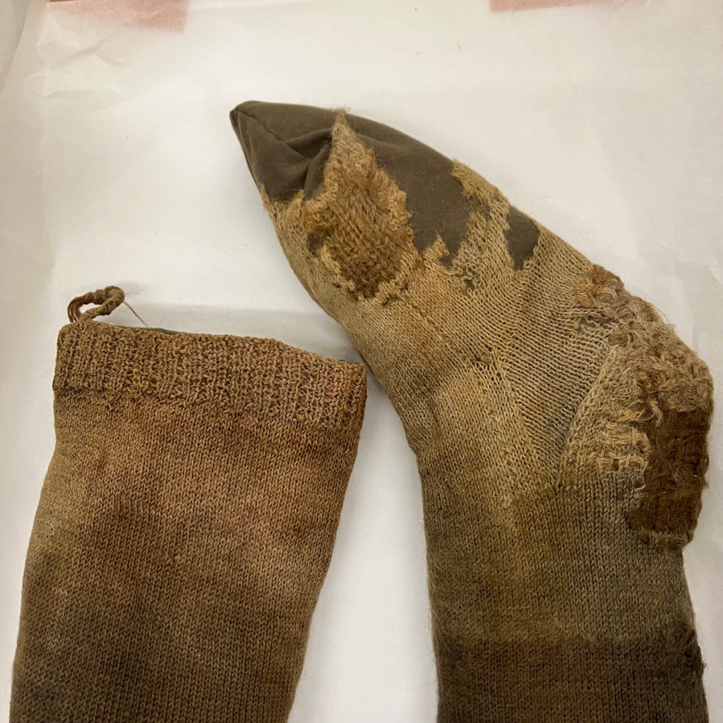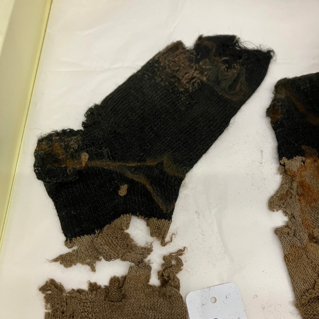 Bij de opgraving van de ‘Twee Gebroeders’ zijn verschillende sokken/kousen gevonden, je ziet meerdere reparaties en sommige kousen lijken nieuwe voeten te hebben gekregen op een zeker moment. De bovenrand heeft ongeveer 112 steken, dus gebreid met fijne naalden en dunne wol. Plantenvezels vallen sneller uiteen, dus gevonden textiel is meestal gemaakt van wol en soms van zijde. Het is nooit helemaal zeker of deze nog werden gedragen door de schipper of dat ze toen al door hun slechte staat gebruikt werden als teerlap of poetslap.