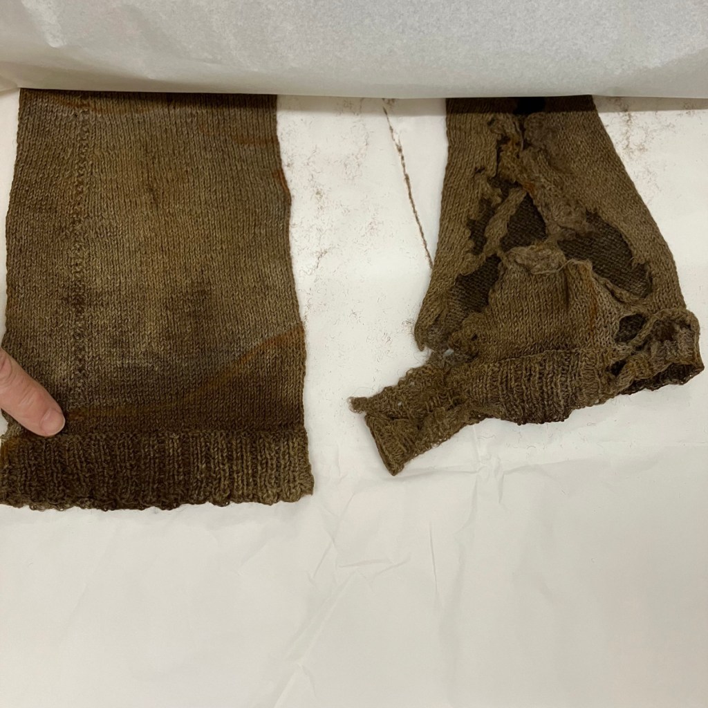 Bij de vondsten in deze wrakken zitten ook objecten of fragmenten die gebreid zijn, niet zo sjiek als de zijden kousen van Texel en erg verkleurd doordat ze in de grond hebben gezeten, maar wel interessant. Sommige vondsten roepen vragen op als ‘wat zou het geweest kunnen zijn?’