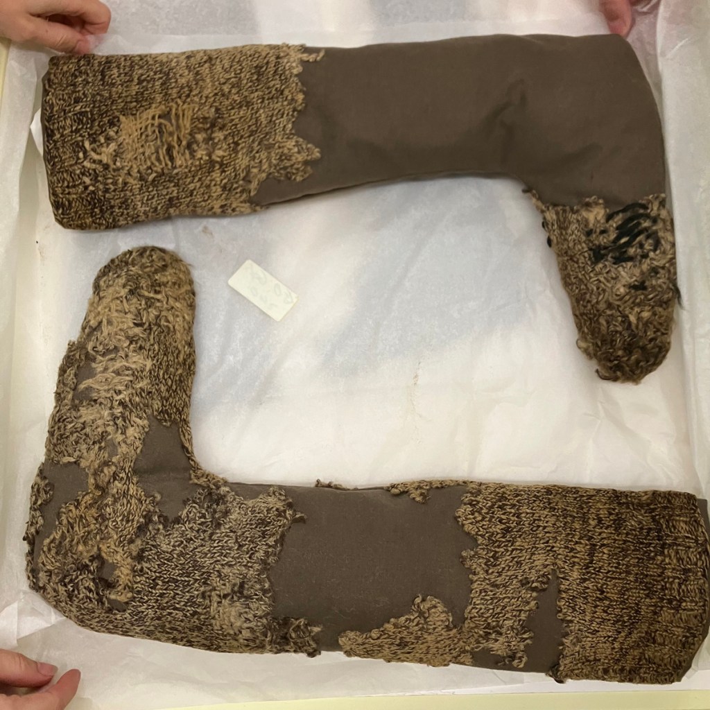 De kousen zijn jaren terug door een textielrestaurator op een vorm vastgezet om ze beter toonbaar te maken en om ze veiliger te kunnen bewaren.