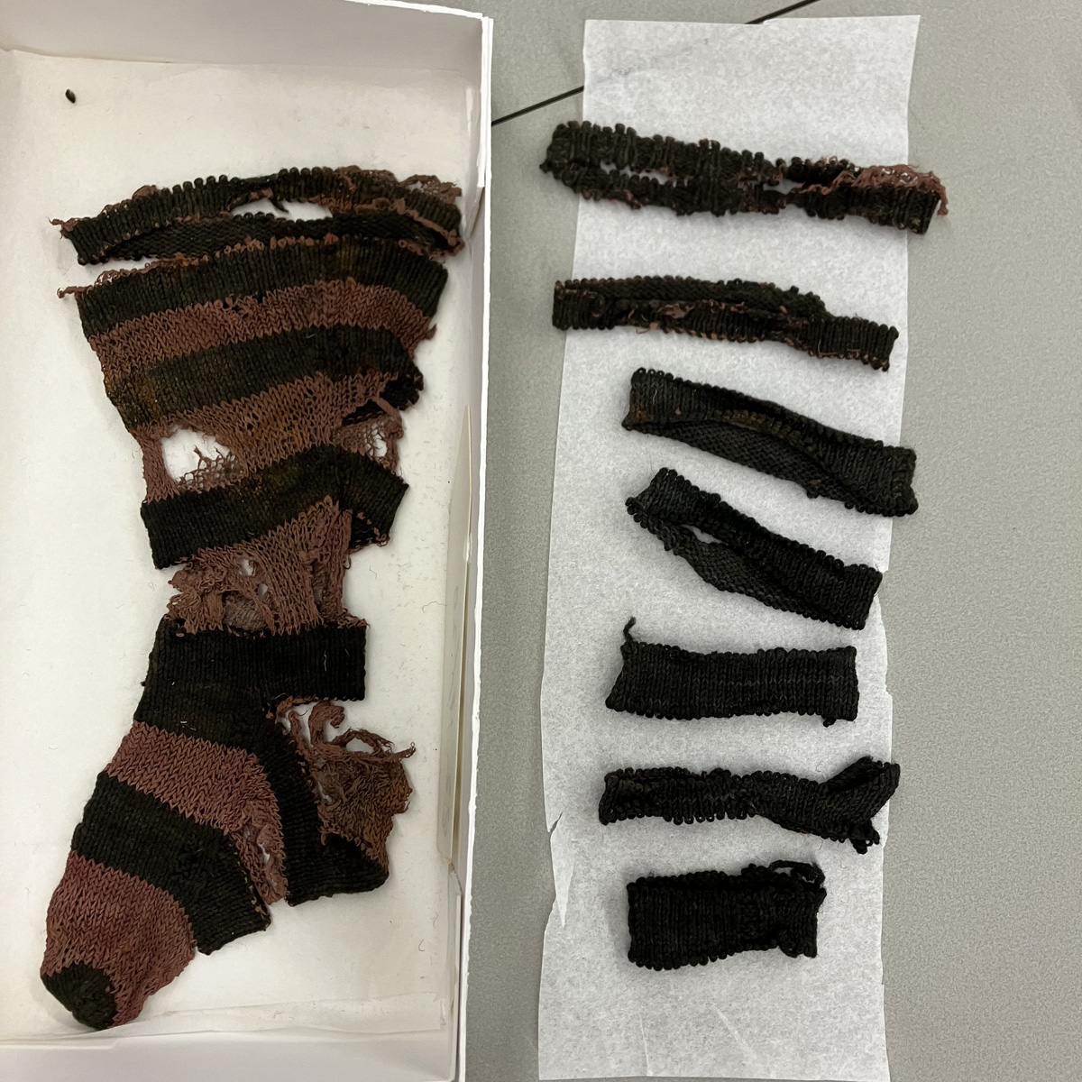 In het wrak van de ‘Drie Gezusters’ werden deze kindersokjes gevonden. Ze zijn gebreid van twee kleuren garen waarbij van de ene sok de strepen van de lichtere kleur bijna helemaal zijn verdwenen. Mogelijk waren deze strepen van een ander, misschien plantaardig materiaal, maar gek genoeg is van de tweede sok wel nog veel bewaard gebleven.